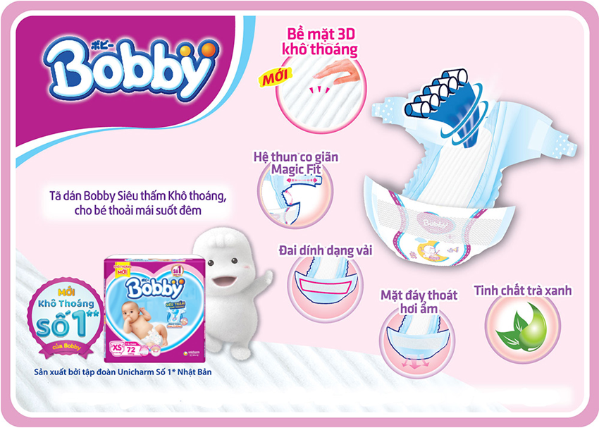 - Tã dán Bobby XS có mặt đáy được thiết kế dạng vải thoát hơi ẩm, giúp đẩy hơi nóng ra ngoài, giảm nhiệt độ trong lòng tã và giữ cho bé da bé luôn khô thoáng. Bên trong có lõi bông mềm mại với lớp siêu dẫn giúp thấm hút chất lỏng nhanh chóng hơn.