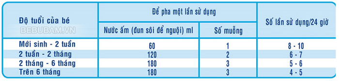 - Dùng nước đã dược đun sôi trong vòng 5 phút và để nguội, cho chính xác lượng nước ấm cần pha vào bình đã vệ sinh sạch, lường bằng muỗng có sẵn trong hộp.