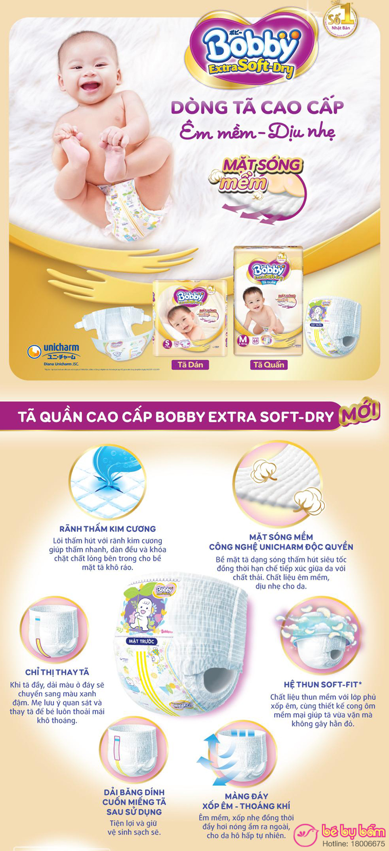 - Tã quần Bobby Extra Soft Dry được sản xuất dưới công nghệ Unicharm độc quyền, sử dụng chất liệu êm ái, dịu nhẹ mềm mại, thân thiện da bé.